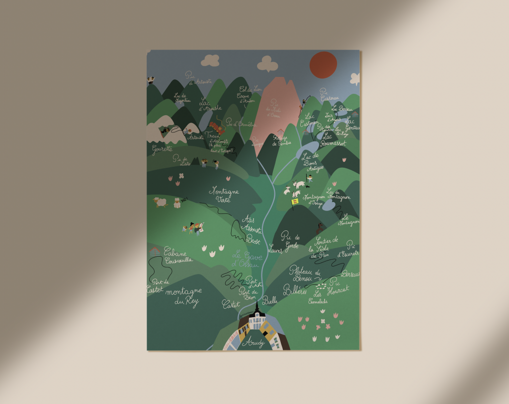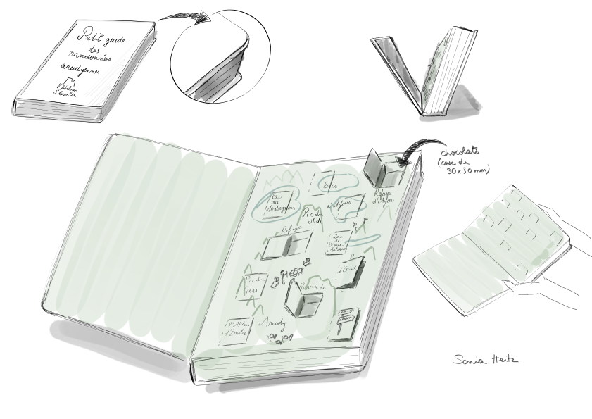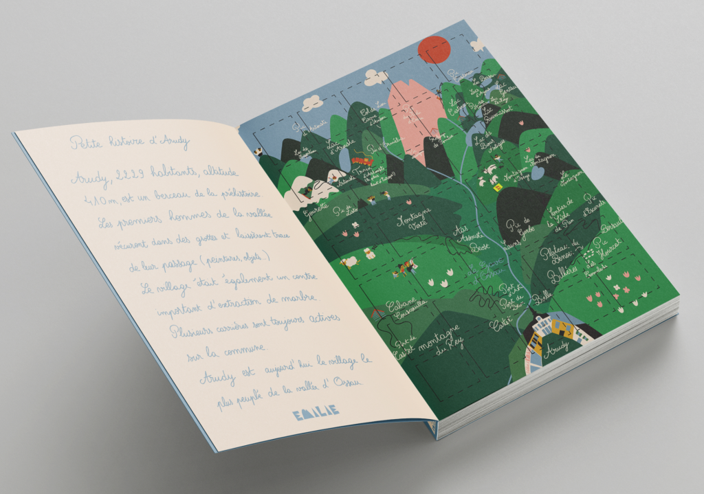 Pour les packagings, j’ai proposé une déclinaison de son logo sur des packagings à moins d’un euro. Puis, dans le cadre de mon projet d’étude, j’ai proposé un packaging plus élaboré : un coffret cadeau original, le « Petit guide des randonnées arudyennes ».